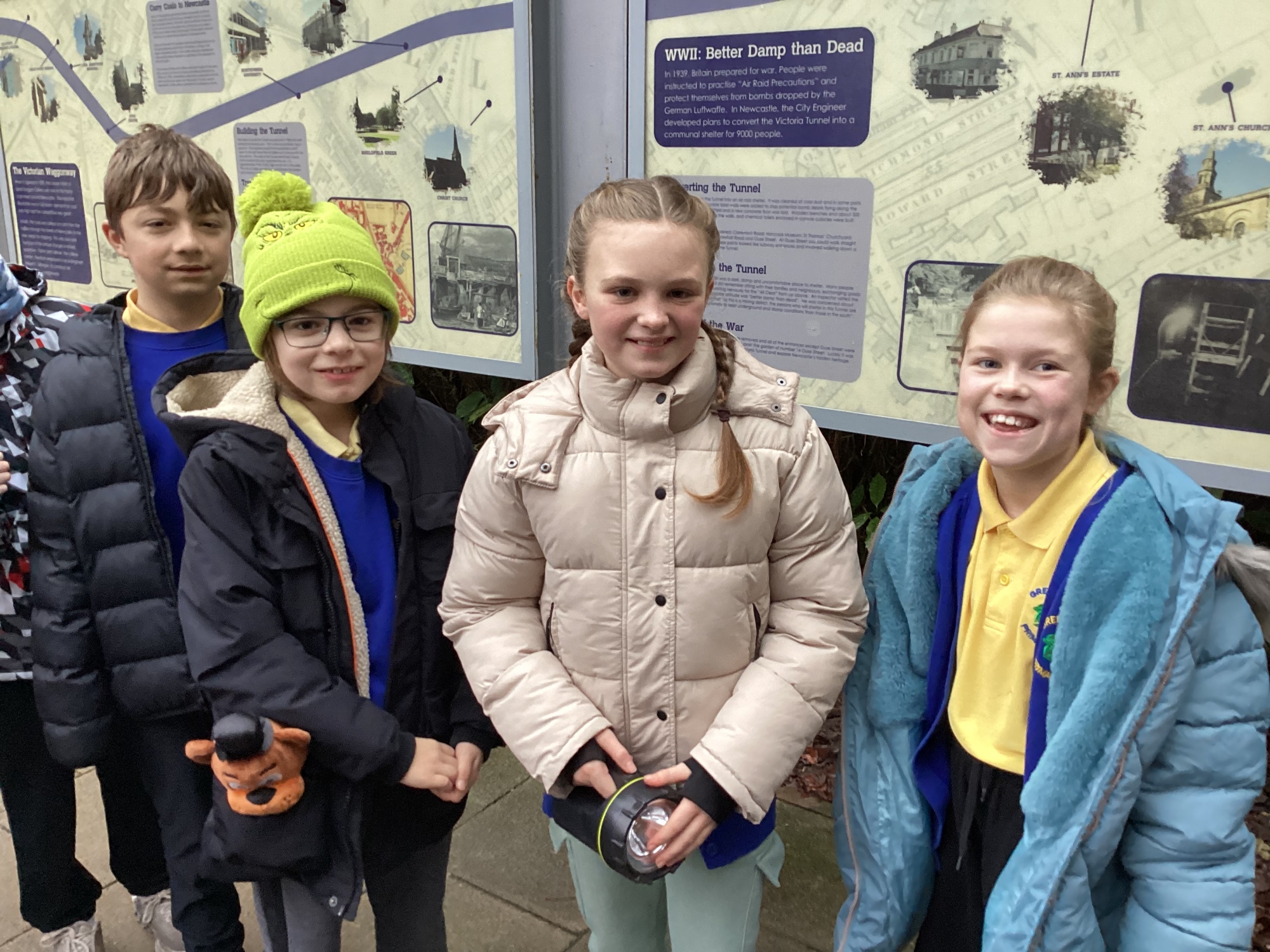 Afterwards, Year 6 headed into the tunnel itself. Armed with torches, they explored a section of the tunnel running from Ouseburn towards Byker. As the air-raid siren sounded, the children experienced what it may have felt like to shelter underground. They listened to real memories from people who lived in Newcastle during the war and saw replica wooden beds and benches used by families seeking safety during bombing raids.