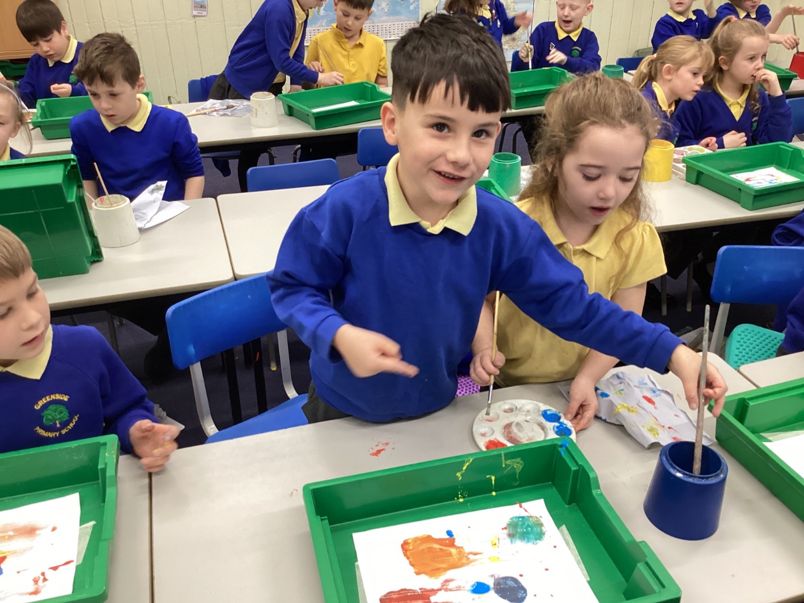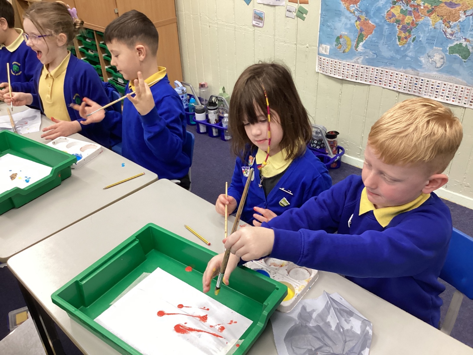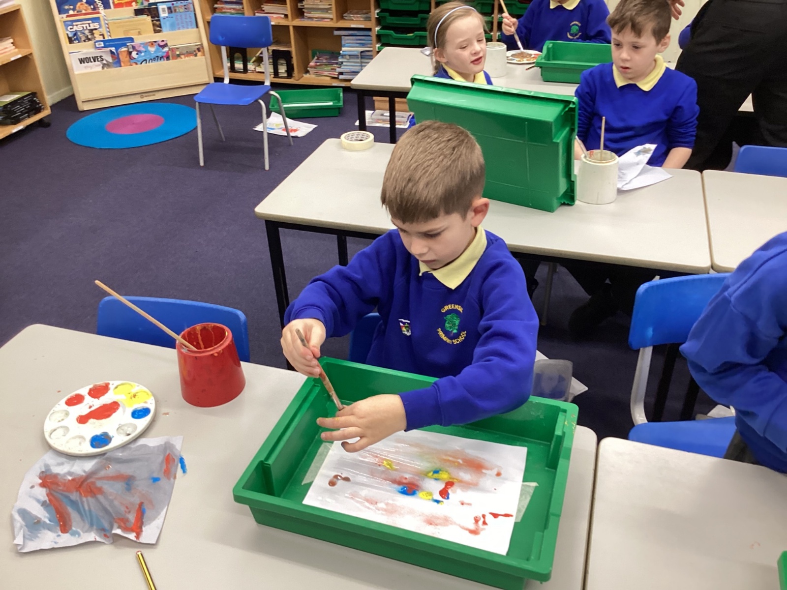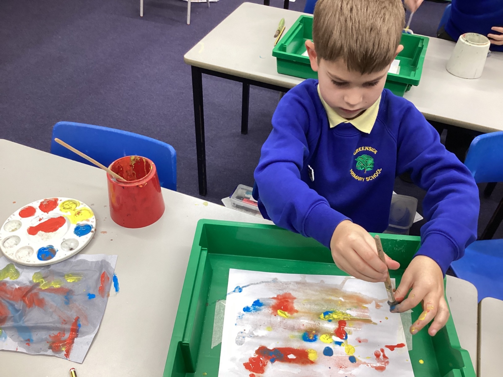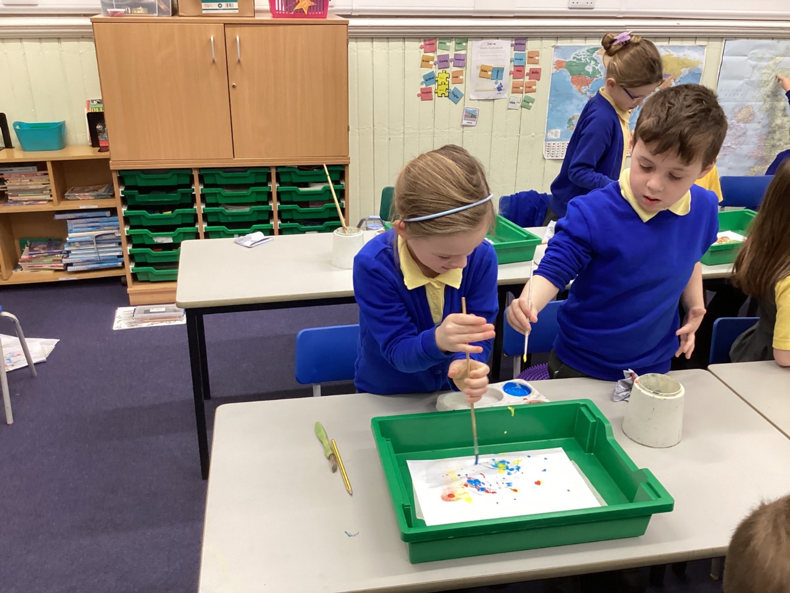 During art today, Year 2 investigated creating secondary colours by observing how primary colours mix. We started by wetting our paper with water so that it was damp. Then, we dripped two primary colours together on the page so that they would mix. By moving the tray, we were able to observe how the colours changed. At the end of the lesson, we discussed our results. Please enjoy looking at our pictures.