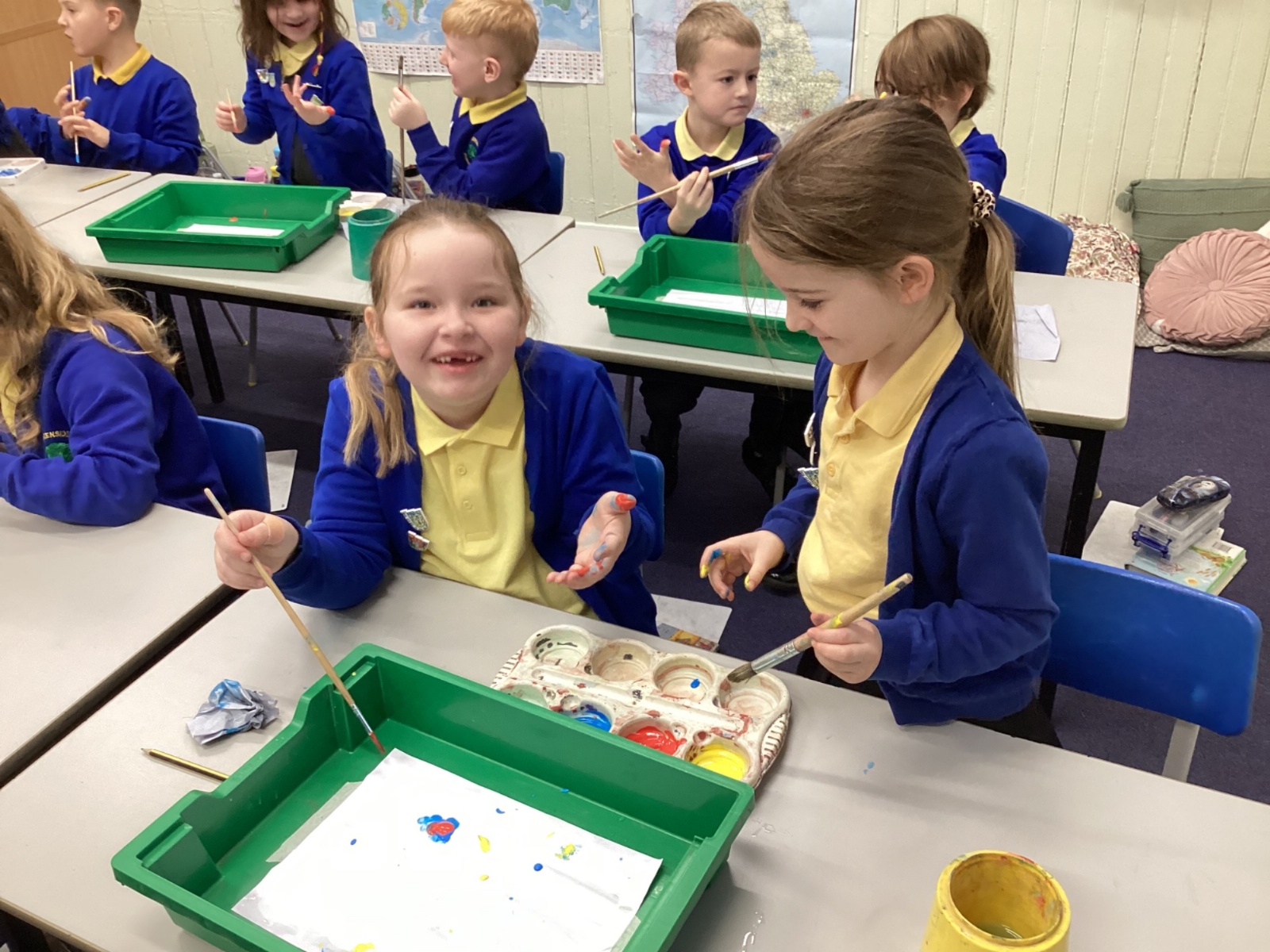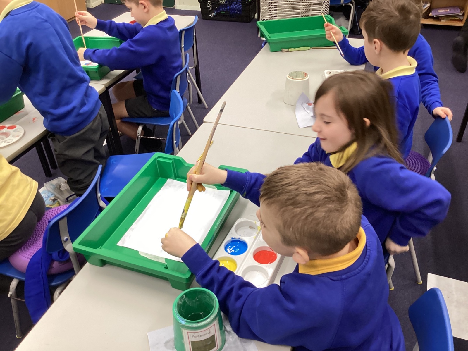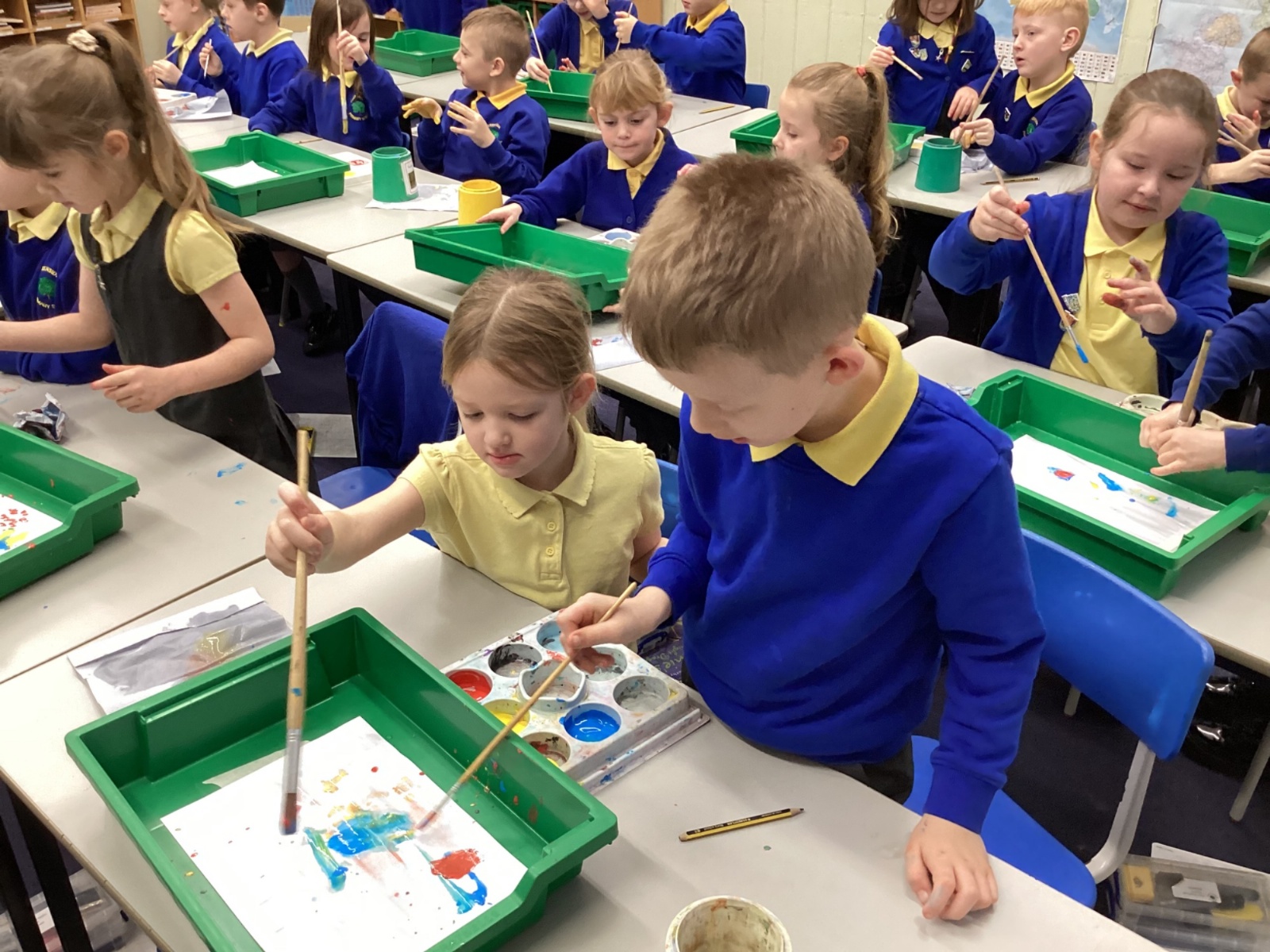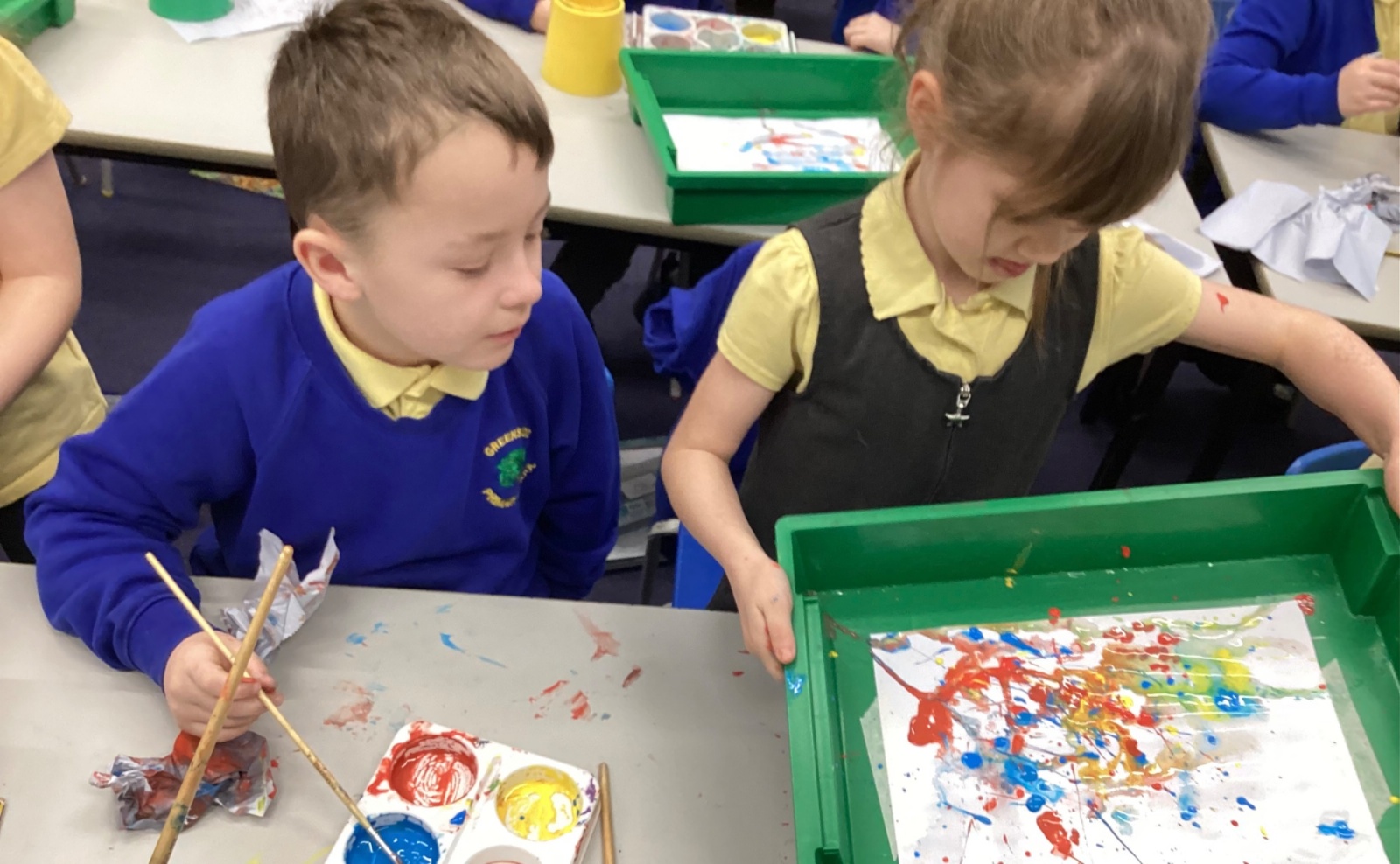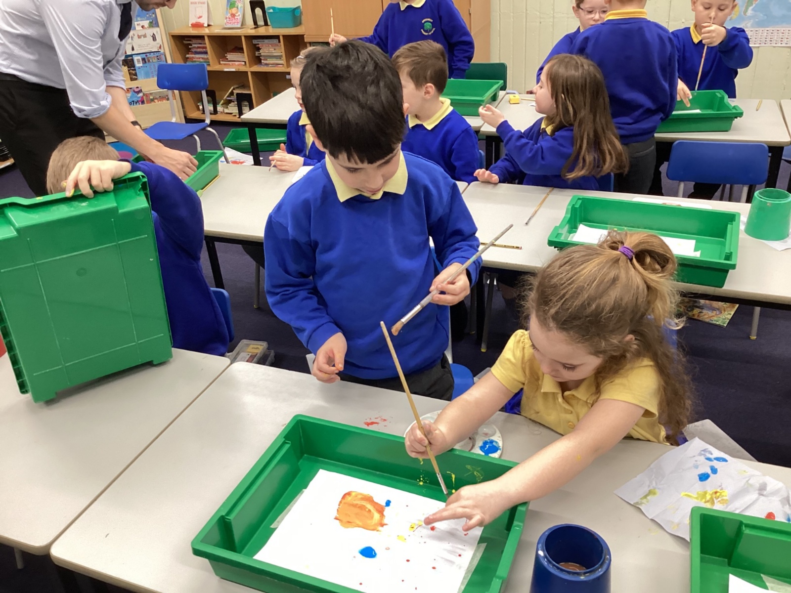 During art today, Year 2 investigated creating secondary colours by observing how primary colours mix. We started by wetting our paper with water so that it was damp. Then, we dripped two primary colours together on the page so that they would mix. By moving the tray, we were able to observe how the colours changed. At the end of the lesson, we discussed our results. Please enjoy looking at our pictures.