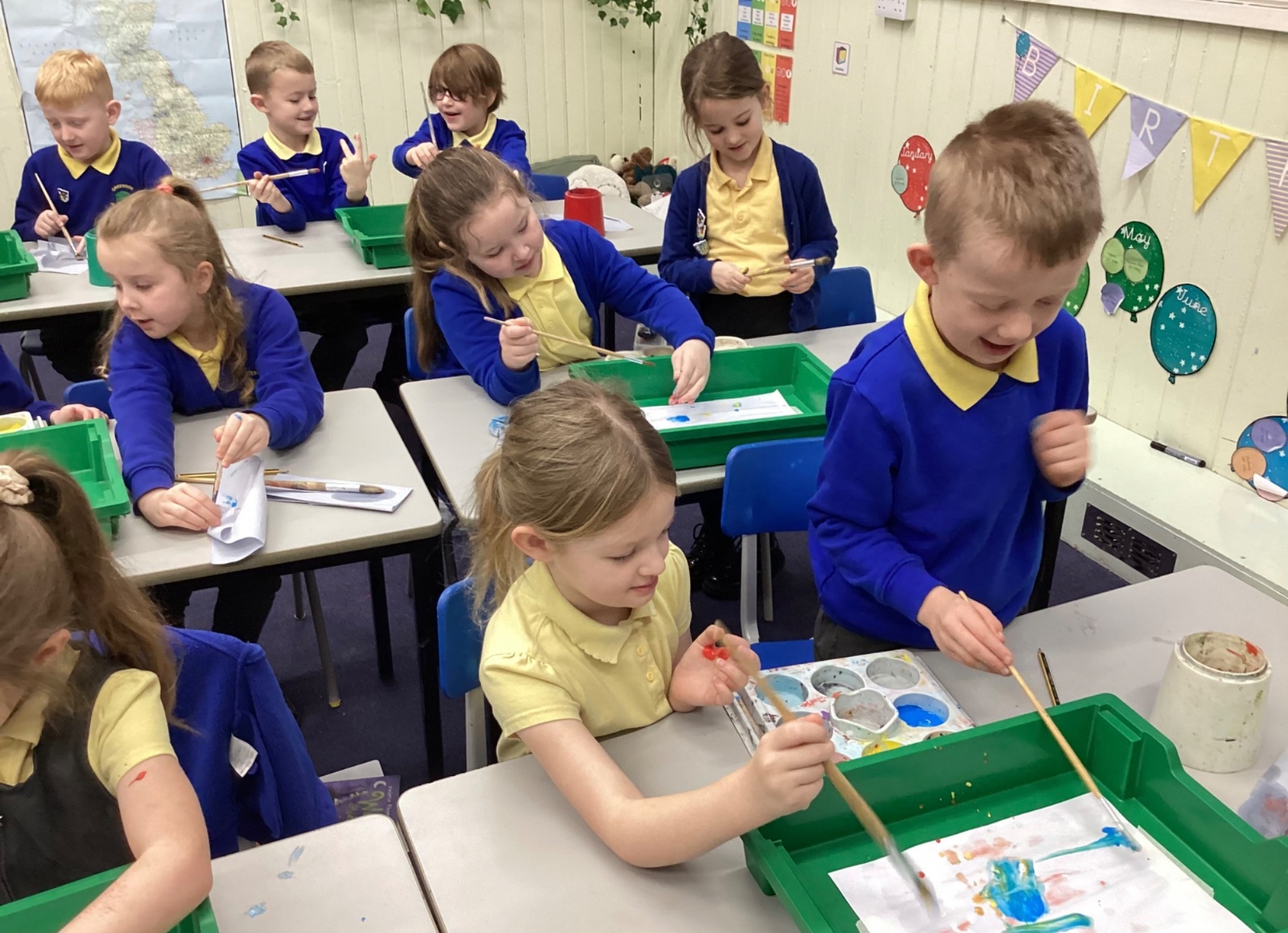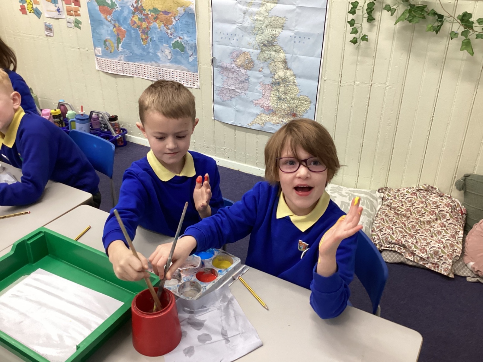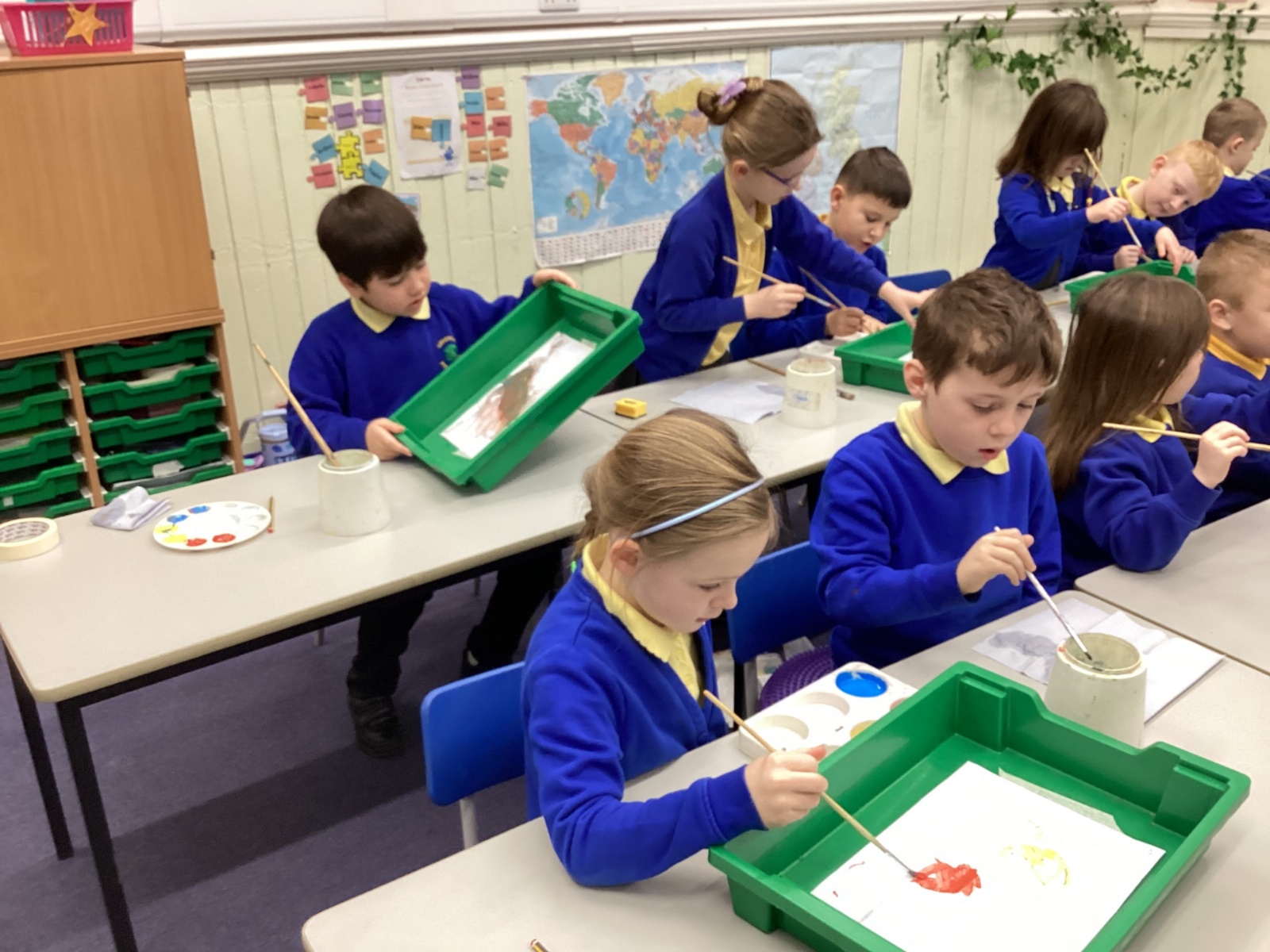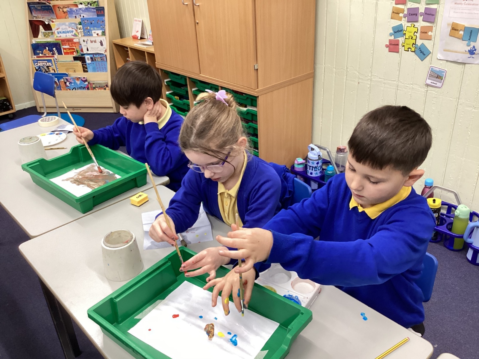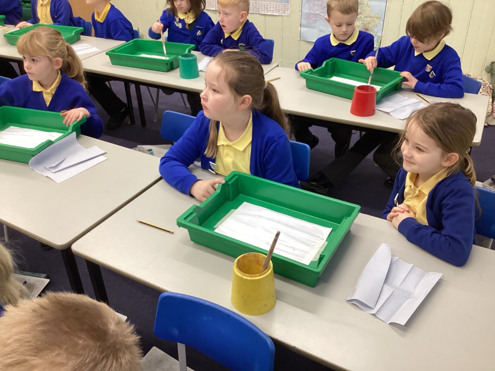 During art today, Year 2 investigated creating secondary colours by observing how primary colours mix. We started by wetting our paper with water so that it was damp. Then, we dripped two primary colours together on the page so that they would mix. By moving the tray, we were able to observe how the colours changed. At the end of the lesson, we discussed our results. Please enjoy looking at our pictures.