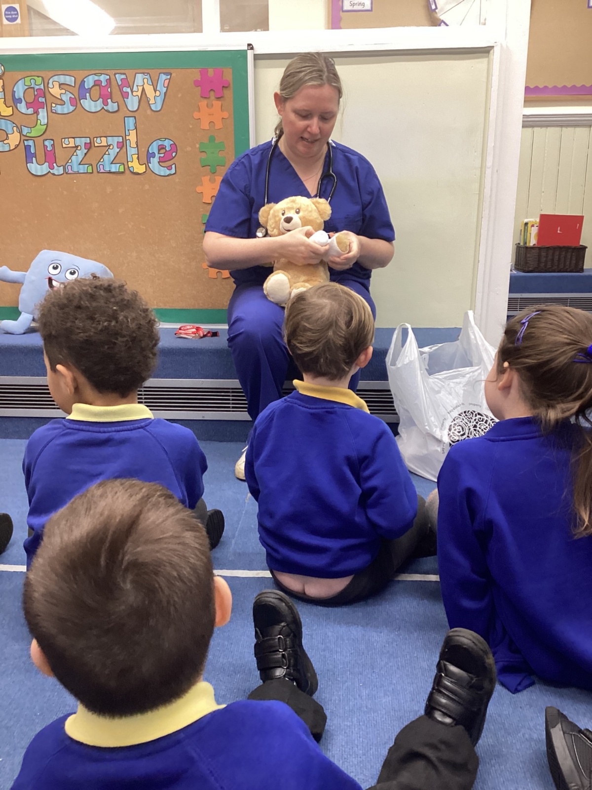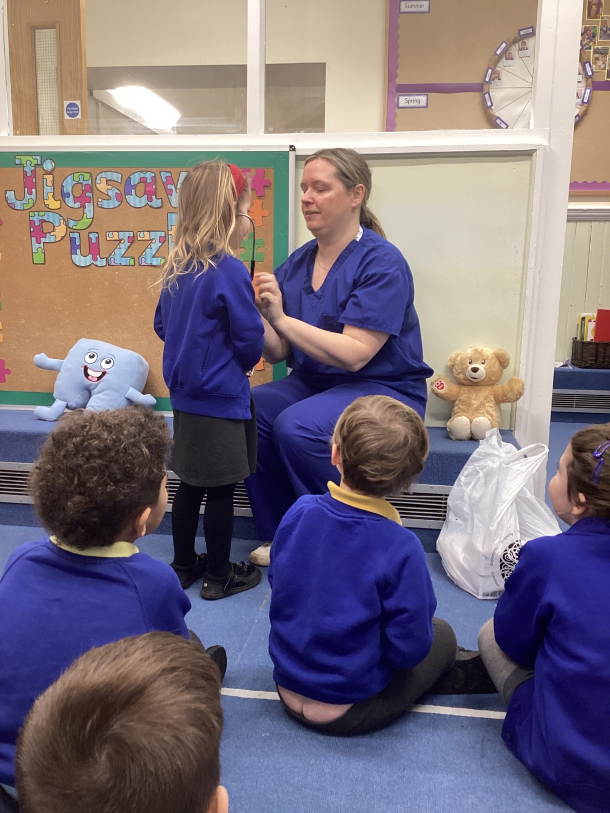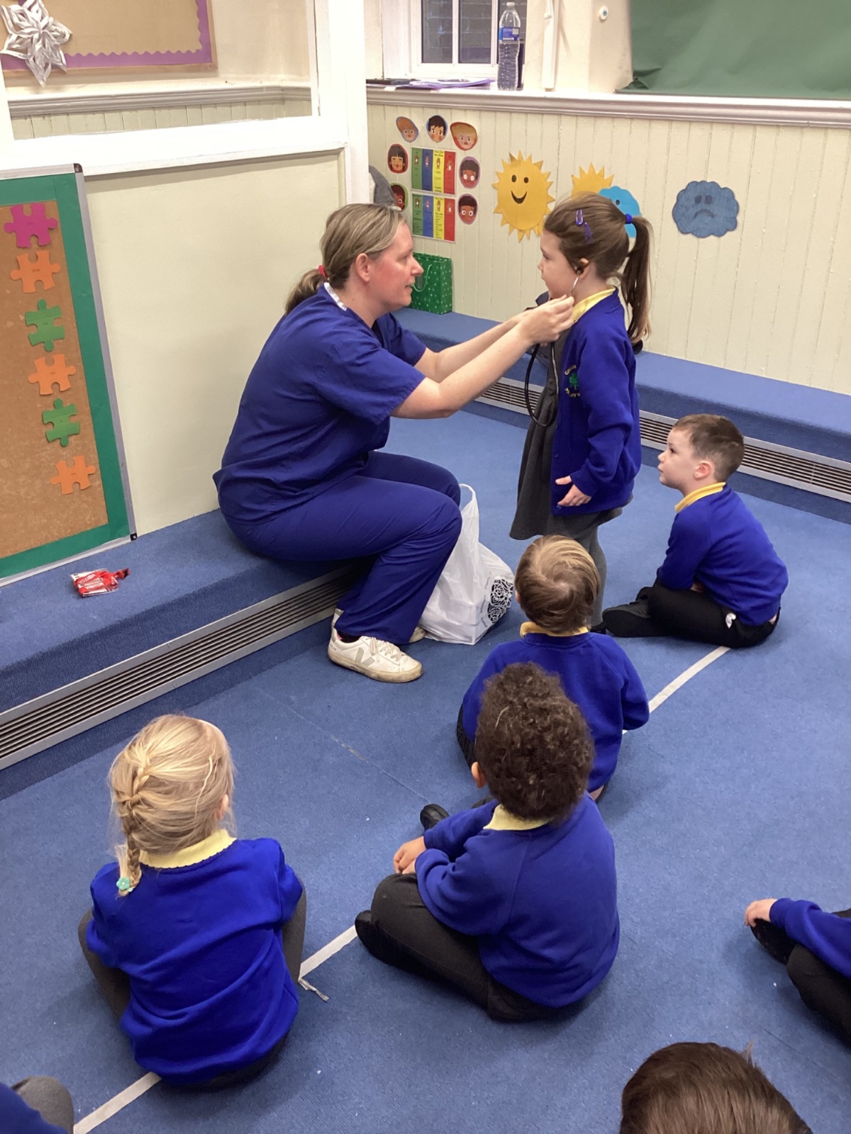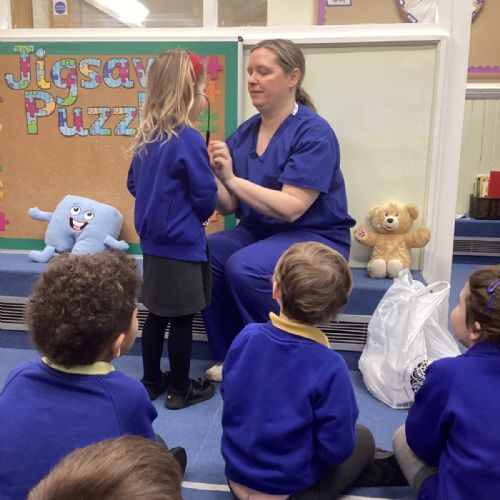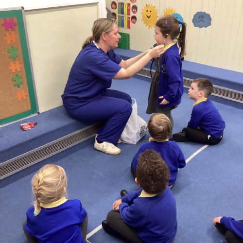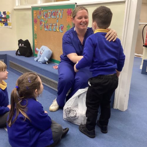 Nurse Faye came to visit our class and told us all about her important job. She showed us her uniform and explained how she helps people when they are feeling unwell or need medical care. The children were fascinated to hear about the different ways she looks after her patients.