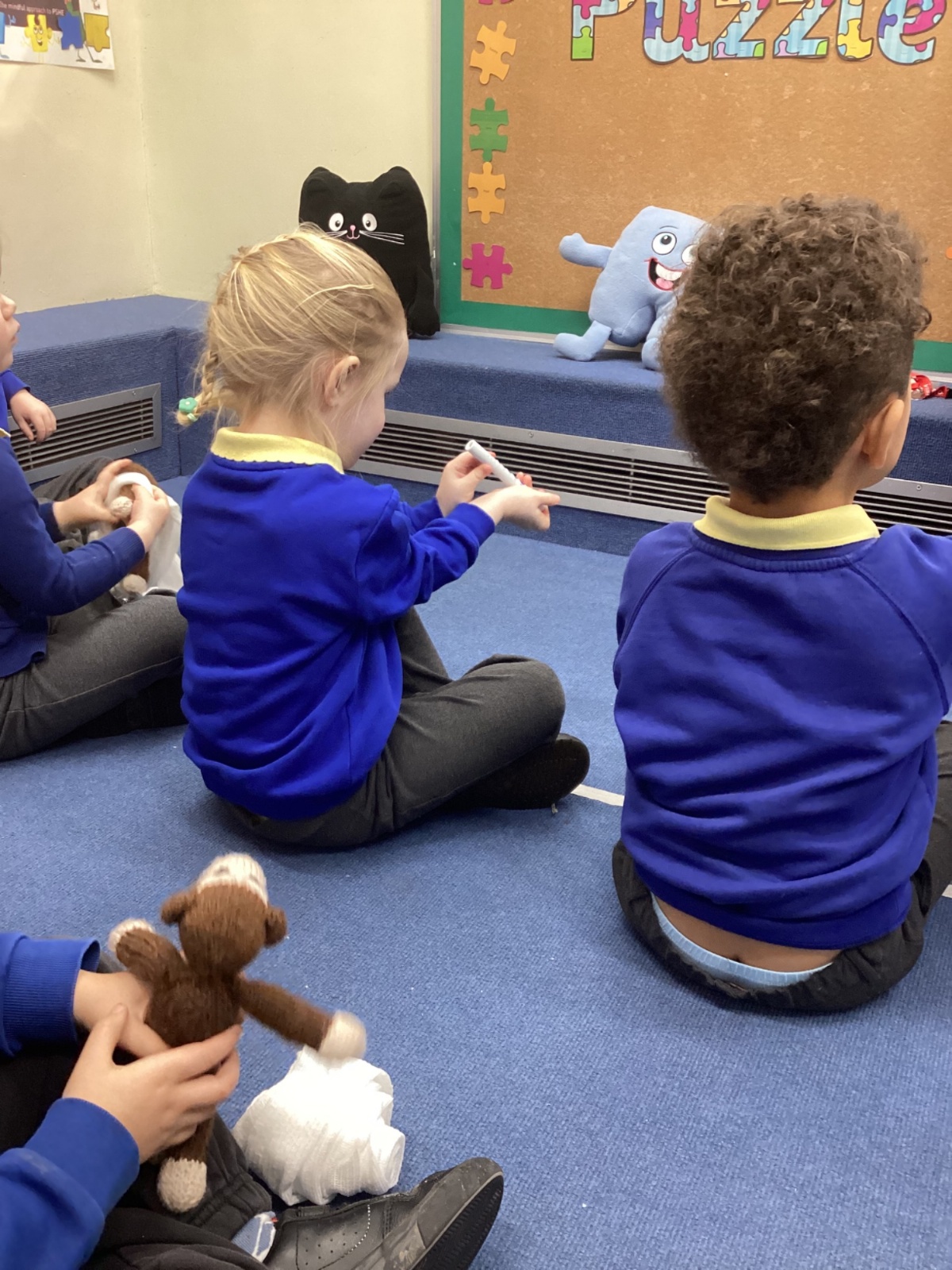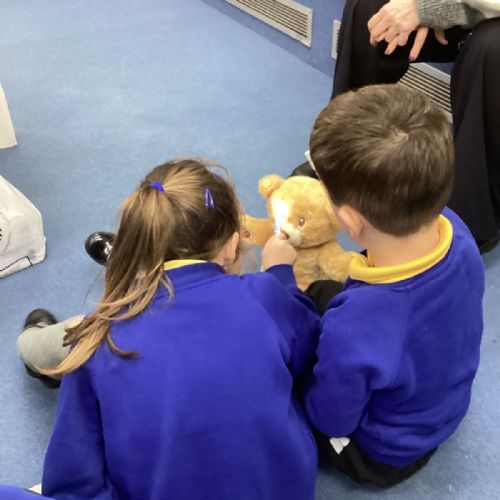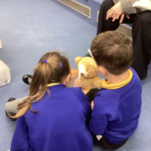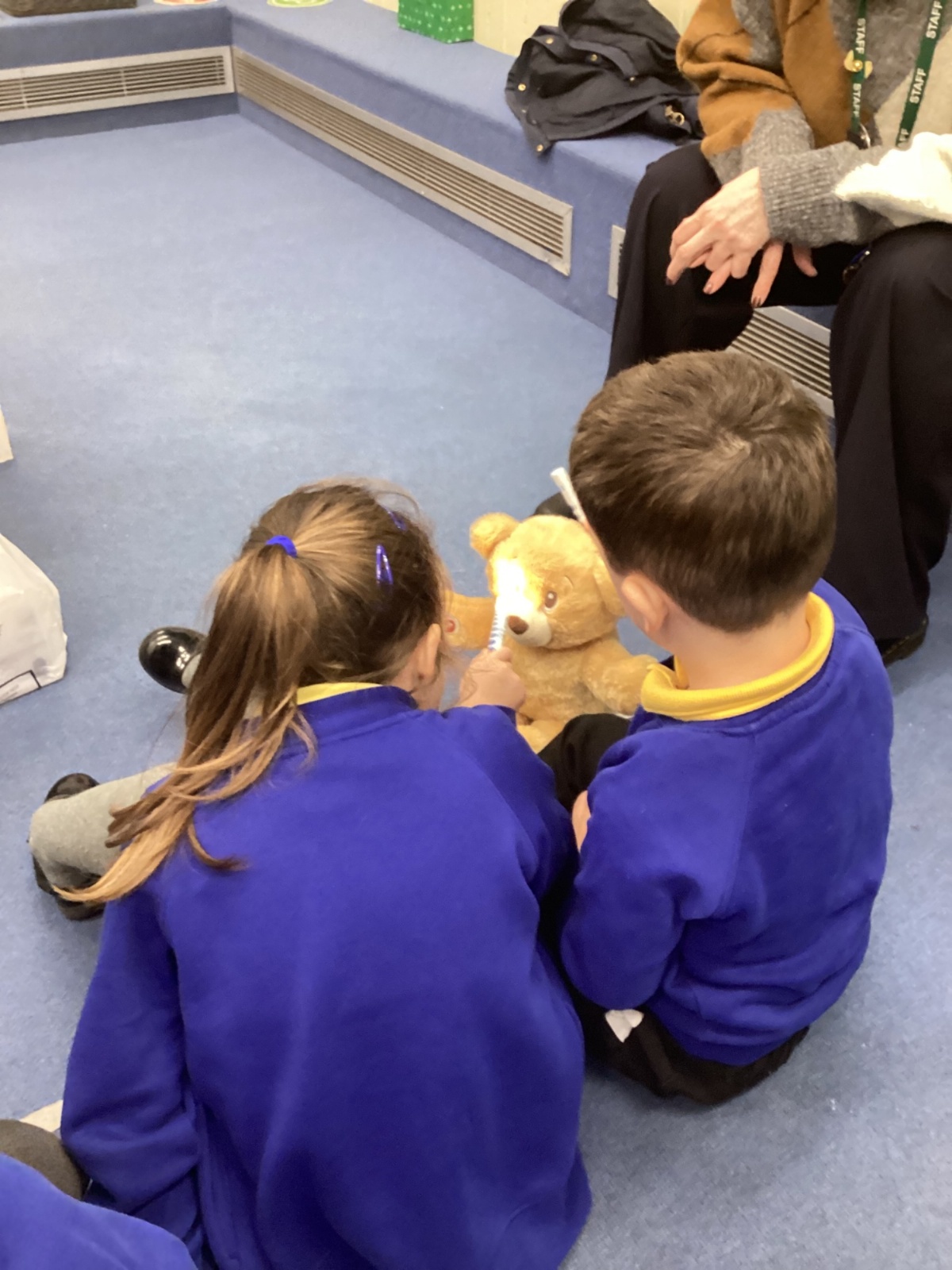 We even had some hands-on practice! Nurse Faye taught us how to apply a bandage, and everyone had a turn practising on a teddy bear. The children also used a stethoscope to listen carefully to their own heartbeats and tried out a special light to check eyes, just like real nurses do.