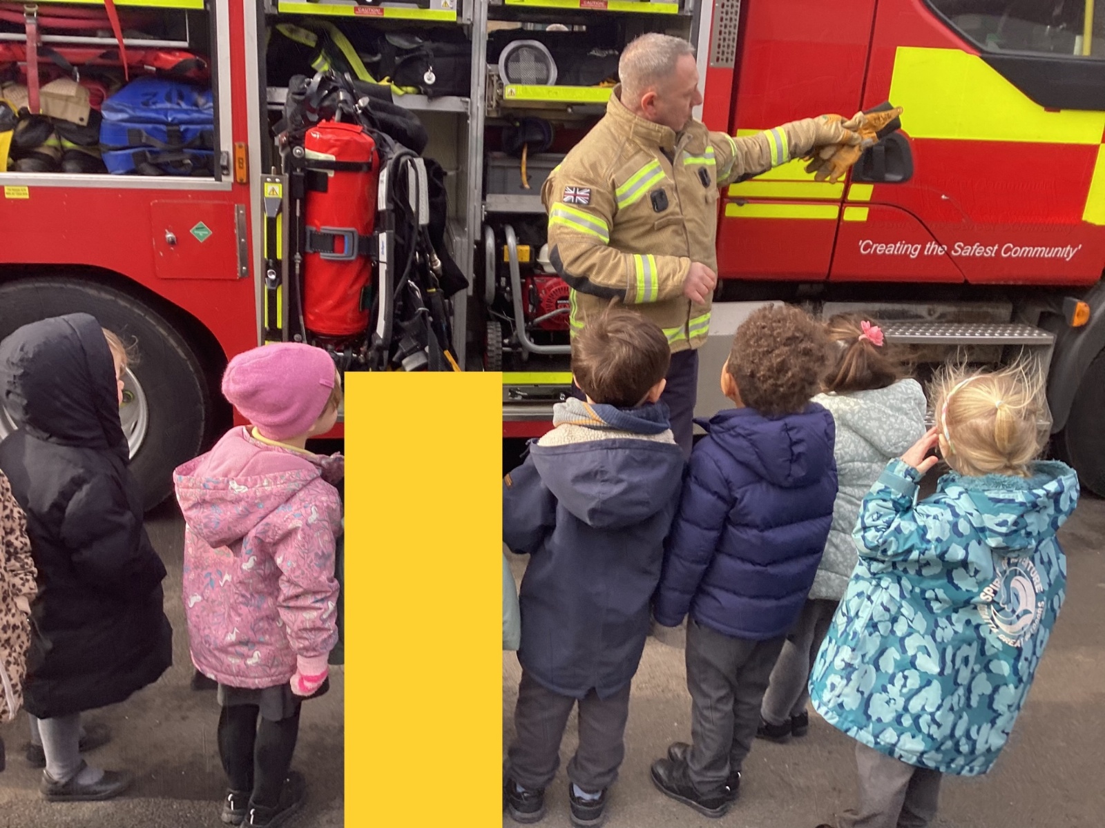 The children were excited as they got the chance to sit inside the fire engine and explore all the different equipment that firefighters wear to keep them safe.